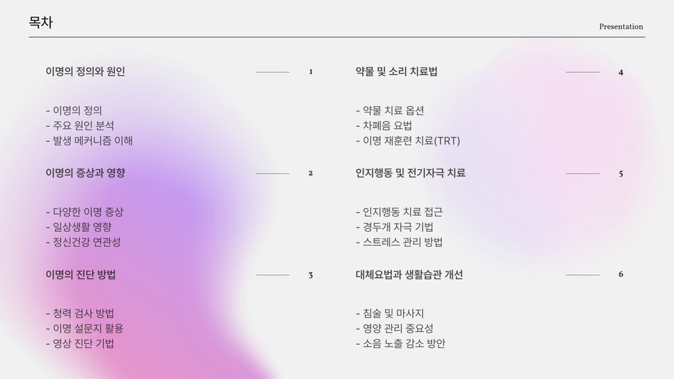 이명은 많은 사람들에게 어려움을 주는 증상입니다. 그러나 다양한 치료 방법과 관리 전략을 통해 효과적으로 대처할 수 있습니다. 원인을 파악하고, 적절한 치료 방법을 선택하는 것이 중요합니다. 이 글에서 소개한 내용을 바탕으로 귀이명치료에 대한 올바른 이해를 돕기를 바랍니다.