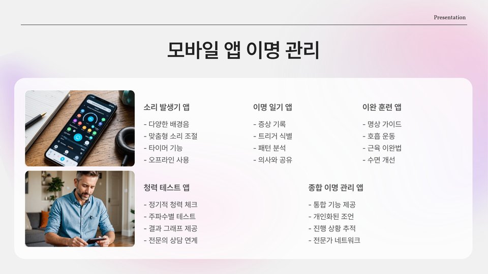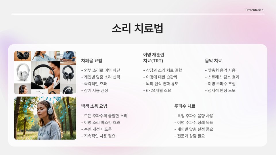 이명 치료에는 여러 가지 방법이 있습니다. 첫 번째로는 청각 재활 프로그램이 있습니다. 이 프로그램은 이명 환자가 소리에 적응하게 도와주며, 치료 및 상담을 통해 이명의 심리를 다루는 데 초점을 맞춥니다. 두 번째로는 소리 치료입니다. 이 방법은 특정한 소리를 사용하여 이명을 덜 인식하게 만드는 방식입니다. 예를 들어, 백색 소음이나 자연의 소리를 들려주는 것입니다.