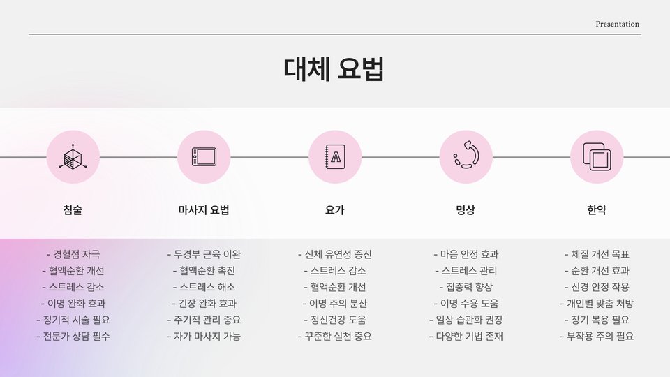 | 대체 요법 | 침술, 명상 등을 통한 스트레스 감소 |