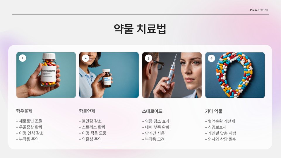 | 약물 치료 | 항우울제 및 항불안제를 통한 증상 완화 |