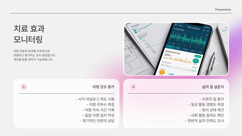 청각 재활은 이명을 잘 조절하는 데 도움을 주며, 이명이 신경에 미치는 영향을 줄이는 데 효과적입니다. 이 치료는 듣기를 향상시키고 소리에 대한 민감성을 줄이는 데 중점을 둡니다. 소음 요법은 이명 소리를 덮어줄 수 있는 소리(예: 자연 소리)가 포함되어, 환자가 이명 소리에 집중하지 않을 수 있도록 도와줍니다. 이러한 방법들은 심리적 안정감을 제공하며, 실제로 여러 환자들에게 긍정적인 효과를 보고하고 있습니다.
