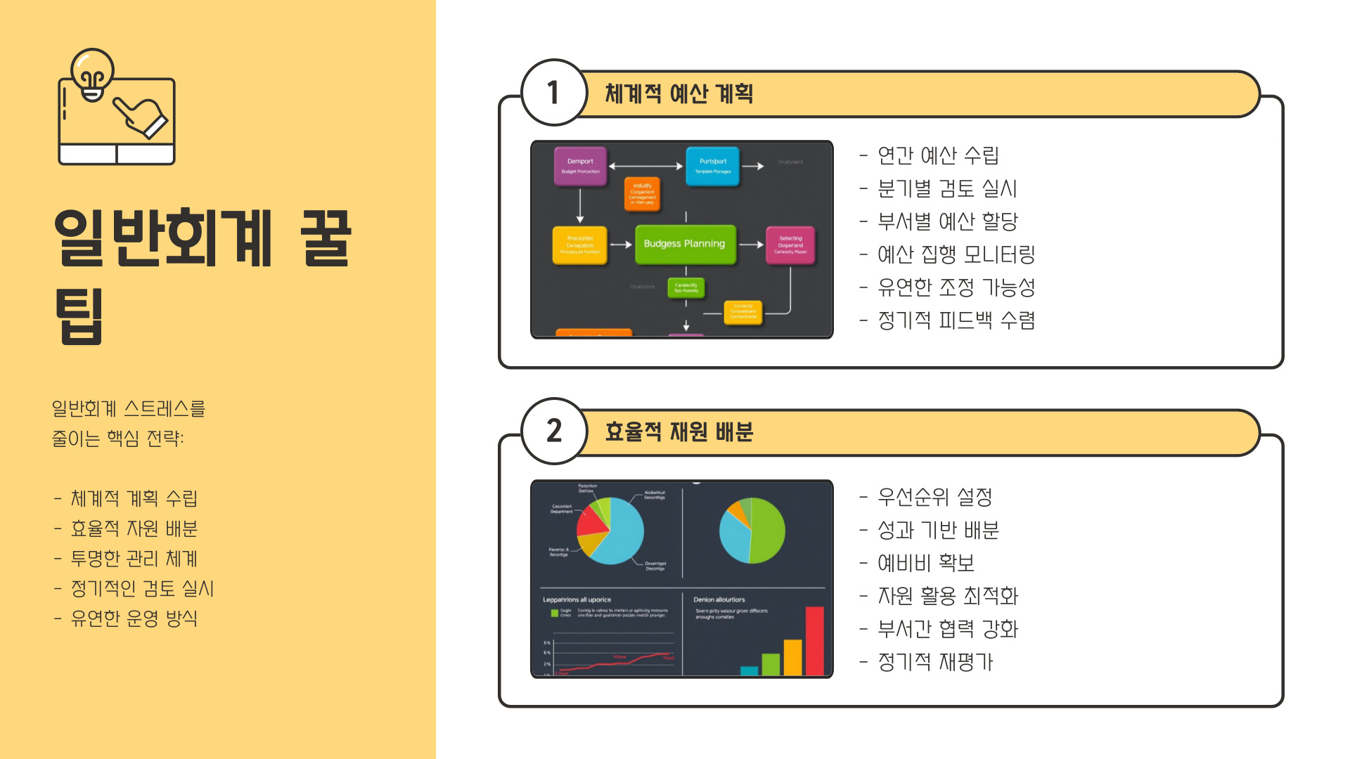 일반회계와 특별회계는 각각의 특성과 복잡성을 지니고 있지만, 적절한 관리 방법과 스트레스 해소 전략을 통해 이를 효과적으로 다루는 것이 가능합니다. 일상적인 회계 기록부터 프로젝트 관리까지, 각 분야에서 체계적이고 명확한 접근 방식을 통해 스트레스를 줄여 나갈 수 있습니다. 필요한 도구와 일정 관리를 통해 여러분의 회계 작업을 더욱 효율적으로 만들어 나가세요.