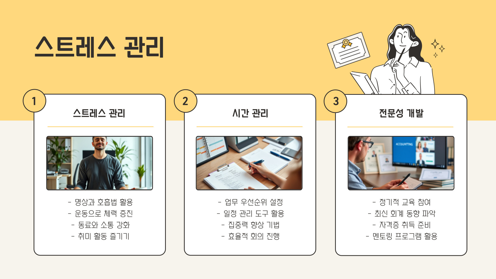 스트레스를 줄이기 위해 몇 가지 유용한 팁을 적용할 수 있습니다. 첫째, 정기적인 교육과 훈련을 통해 회계 규정을 최신 상태로 유지하세요. 둘째, 업무를 효율적으로 관리하기 위해 적절한 소프트웨어 사용을 고려해야 합니다. 회계 소프트웨어는 데이터 입력과 관리의 정확성을 높여주며, 자동화된 기능을 통해 시간 절약이 가능합니다. 셋째, 팀 내 소통을 강화하여 프로젝트 관련 정보를 신속하게 공유하고 문제를 조기에 해결할 수 있습니다.