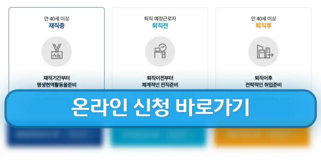 | 생애경력서비스 | 재직자 및 구직자 | 경력 설계 및 발전 지원. 연령대에 따라 맞춤형 프로그램 제공 (40대: '커리어 빌드업', 50대: '커리어 확장', 60대: '경험 공유'). |