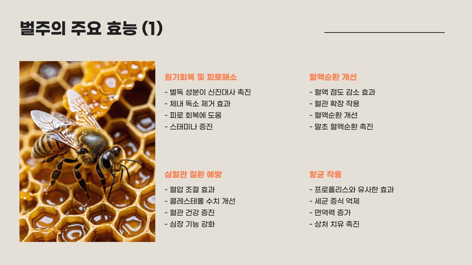 - 벌주는 면역력 강화와 피로 회복에 효과적입니다.