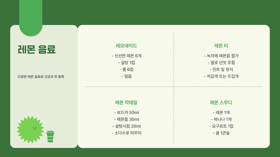 또한, 레몬즙은 음료로도 인기가 높습니다. 레몬 에이드는 여름철에 특히 사랑받는 음료로, 시원하고 상큼한 맛이 더위를 날려줍니다. 하지만 설탕이나 인공 감미료를 과다하게 사용하지 않는 것이 중요합니다.