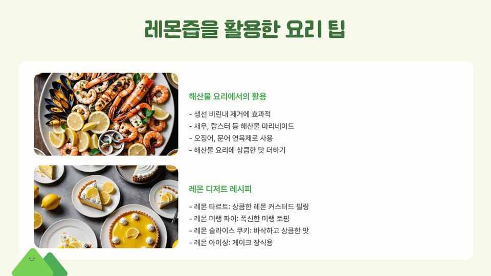 레몬즙은 다양한 요리에 활용할 수 있는 재료입니다. 가장 기본적으로는 레몬즙 드레싱이 있습니다. 신선한 채소와 올리브 오일에 레몬즙을 더하면 간단하면서도 상큼한 샐러드를 만들 수 있습니다. 이는 식사에 추가적인 맛을 더해 줄 뿐만 아니라, 건강식으로도 손색이 없습니다.