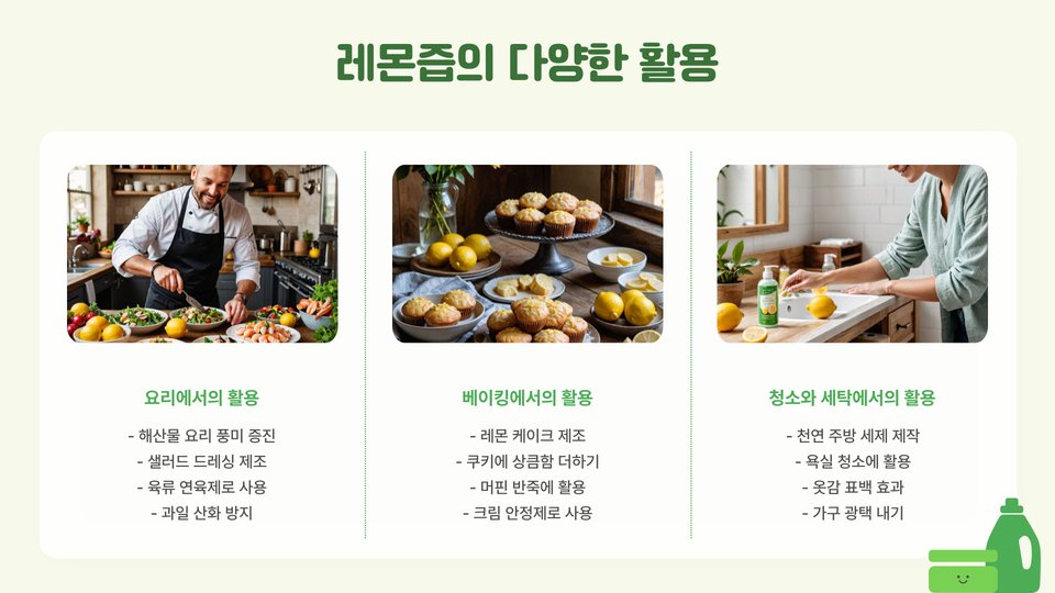 레몬즙은 다양한 요리에 활용할 수 있는 다재다능한 재료입니다. 샐러드 드레싱에 레몬즙을 추가하면 상큼한 맛을 더할 수 있습니다. 예를 들어, 올리브유와 함께 섞어 샐러드에 뿌리면 건강한 샐러드로 변신합니다.