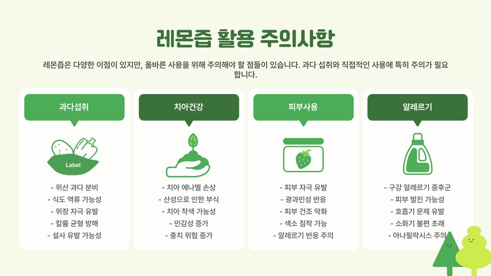 레몬즙은 많은 건강 효능을 가지고 있지만, 과다 섭취 시 위장 문제를 일으킬 수 있습니다. 특히 위염이나 위장 장애가 있는 경우 주의가 필요합니다.