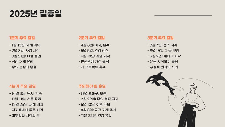 마지막으로, 운세는 단순한 예측이 아닌 삶의 방향성을 잡아주는 정보라는 점을 잊지 말아야 합니다. 2025년의 운세가 여러분의 삶에 긍정적인 영향을 줄 수 있기를 바랍니다.