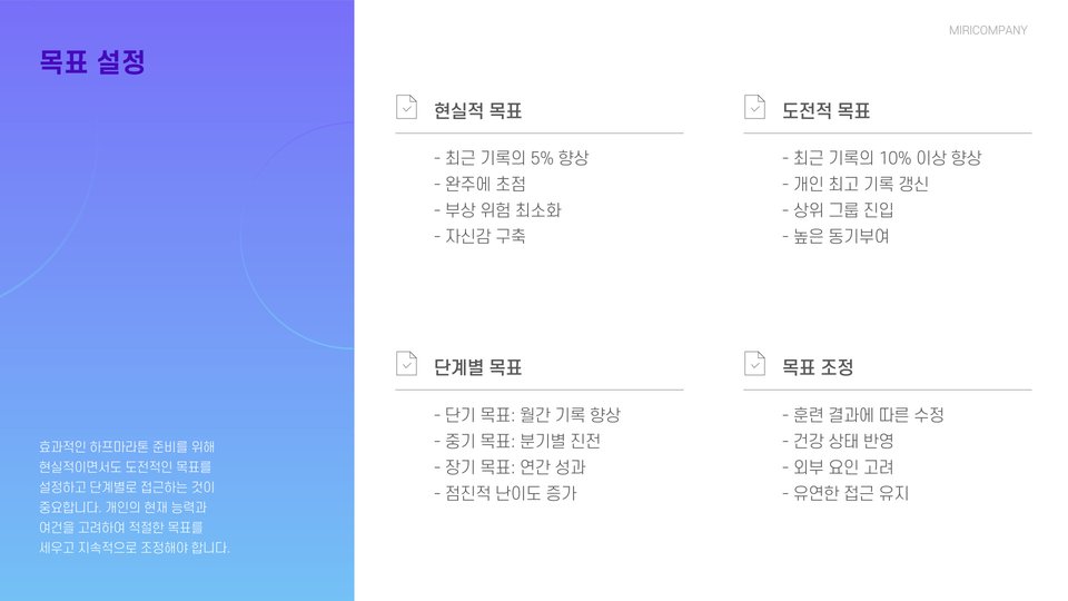 훈련 계획은 구체적이어야 하며, 각 세션마다 목표를 설정해야 합니다. 예를 들어, 장거리 훈련에서는 일정한 페이스를 유지하는 것과 함께 간헐적으로 속도를 올리는 훈련을 포함해야 합니다. 이를 통해 주자는 다양한 페이스에서의 레이스 준비가 가능합니다.