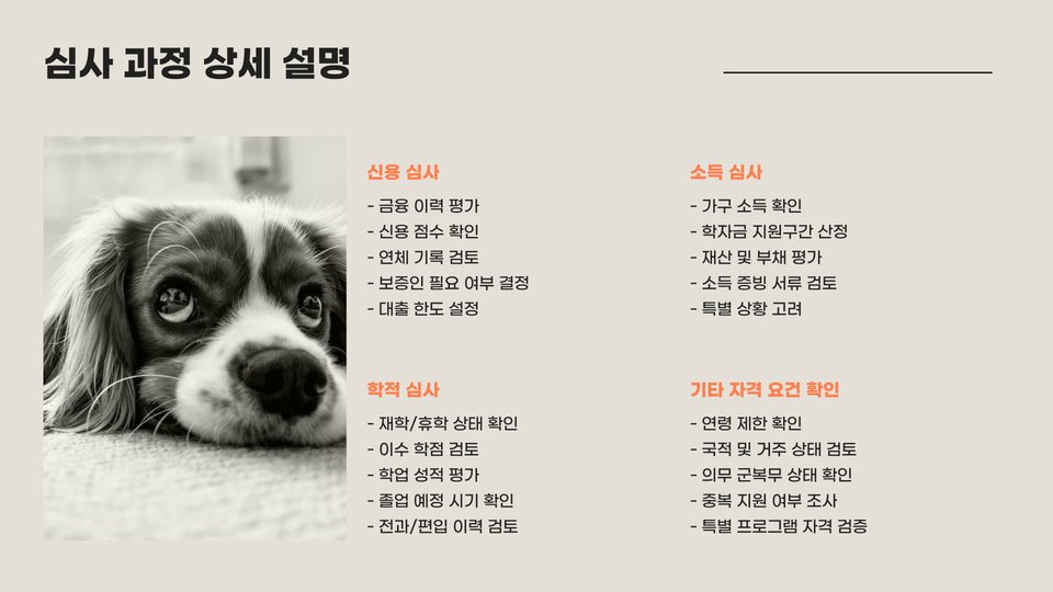 대출 심사는 신청자의 신용도와 재정 상황을 기반으로 진행됩니다. 따라서, 신용 점수가 낮거나 재정적으로 불안정한 경우 심사기간이 길어질 수 있습니다. 심사기간 동안 대출 기관은 신청자의 학업 계획과 재정 상태를 면밀히 검토합니다.