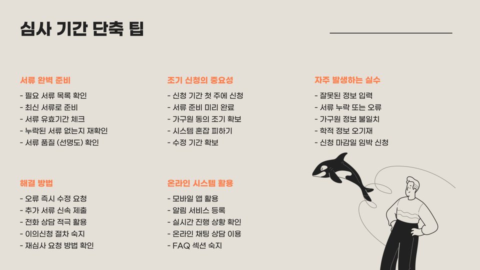 - 신청 시 요구 서류를 미리 준비하는 것이 심사 기간 단축에 도움이 됨.
