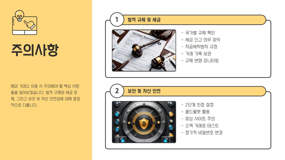- 해외 거래소의 장점과 단점을 균형 있게 고려해야 한다.