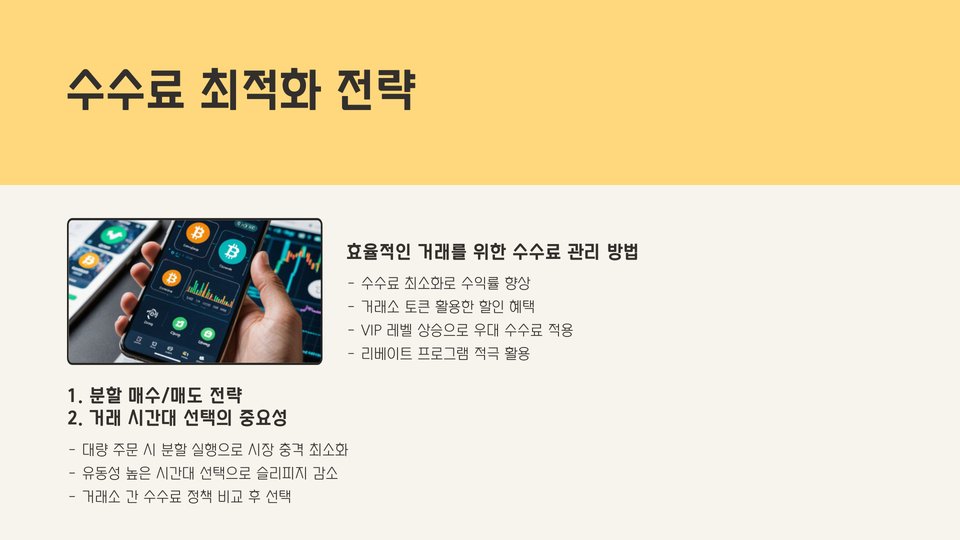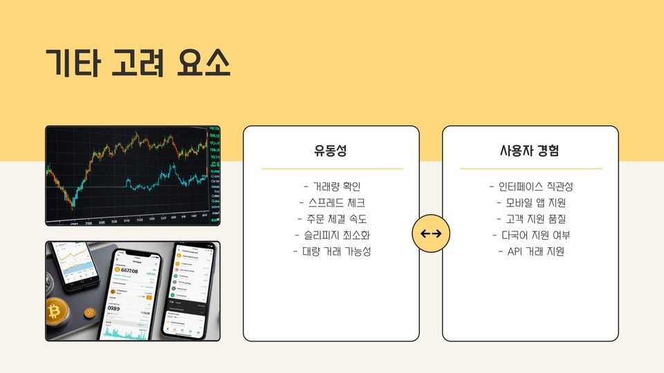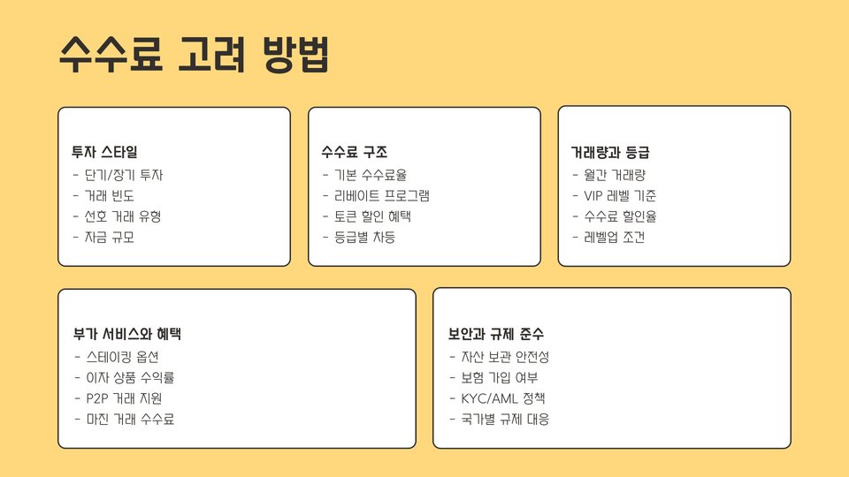 - 거래소 선택 시 수수료 외에도 신뢰성과 고객 지원을 고려해야 한다.