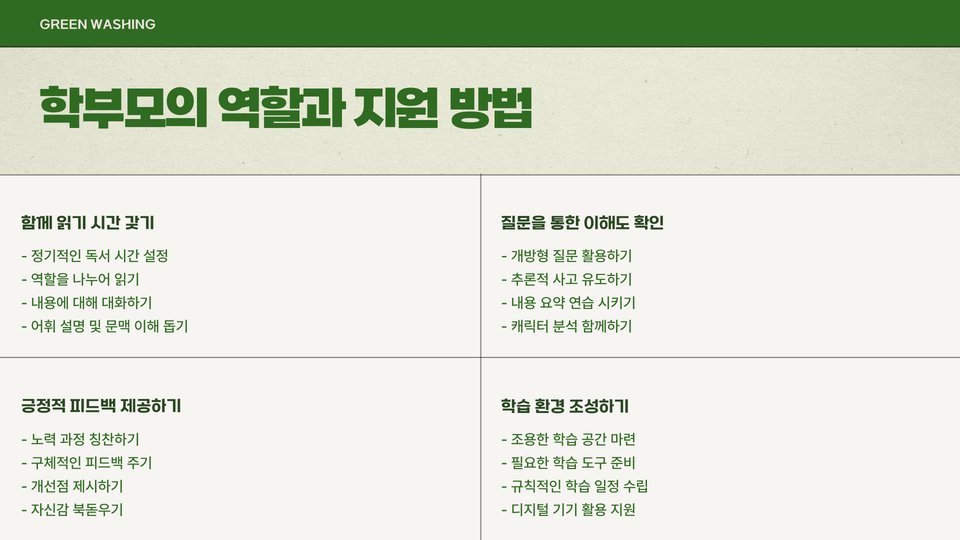 부모는 아이들의 독서 활동을 주의 깊게 관찰하고, 필요한 경우 적절한 피드백을 제공해야 합니다. 아이들이 독서에서 어려움을 겪고 있다면, 가이드를 제공하거나, 추가 자료를 추천하는 것이 좋습니다.
