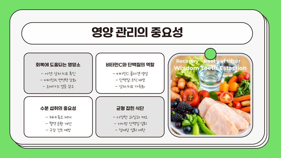 사랑니 발치 후에는 식사 관리가 매우 중요합니다. 발치 후 24시간 동안은 단단한 음식이나 뜨거운 음식을 피하고, 부드러운 식사를 권장합니다. 죽, 스무디, 요거트와 같은 부드러운 음식이 좋습니다.