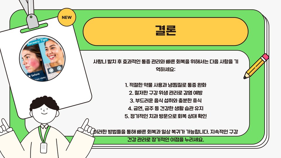 사랑니 발치 후의 통증은 불가피한 과정이지만, 위의 세 가지 방법을 통해 효과적으로 관리할 수 있습니다. 이러한 방법들을 통해 불편한 시간을 조금이나마 부담 없이 보내시길 바랍니다. 만일 통증이 심해지거나 이상 증상이 있을 경우, 반드시 전문의를 찾아 상담하는 것이 필요합니다.