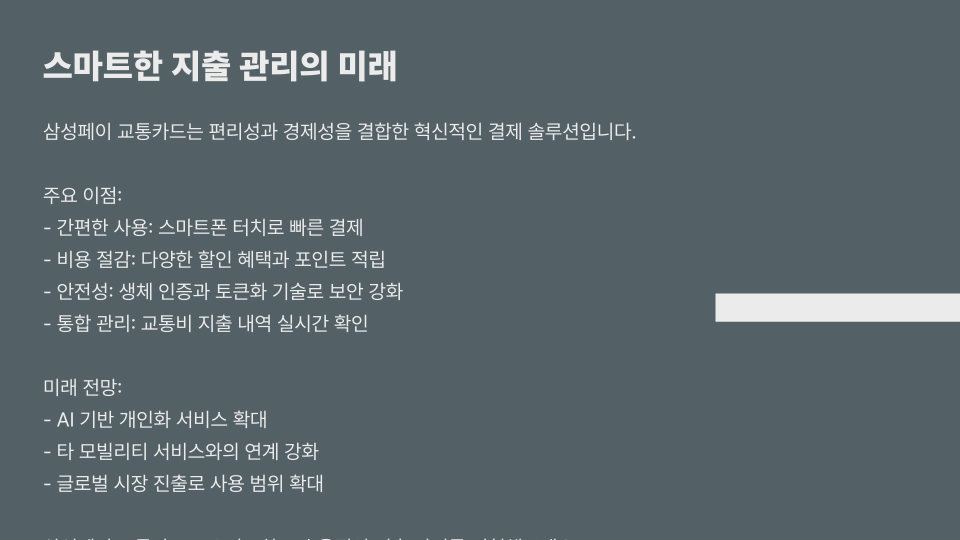- 삼성페이 교통카드는 스마트폰을 통한 간편한 결제 수단입니다.