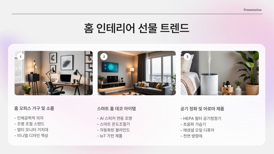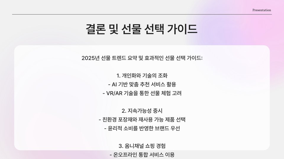 이와 같은 선물들은 2025년의 트렌드와 어우러져 많은 사람들에게 사랑받을 것입니다. 선물 선택 시는 개인의 취향을 고려하는 것이 중요합니다.