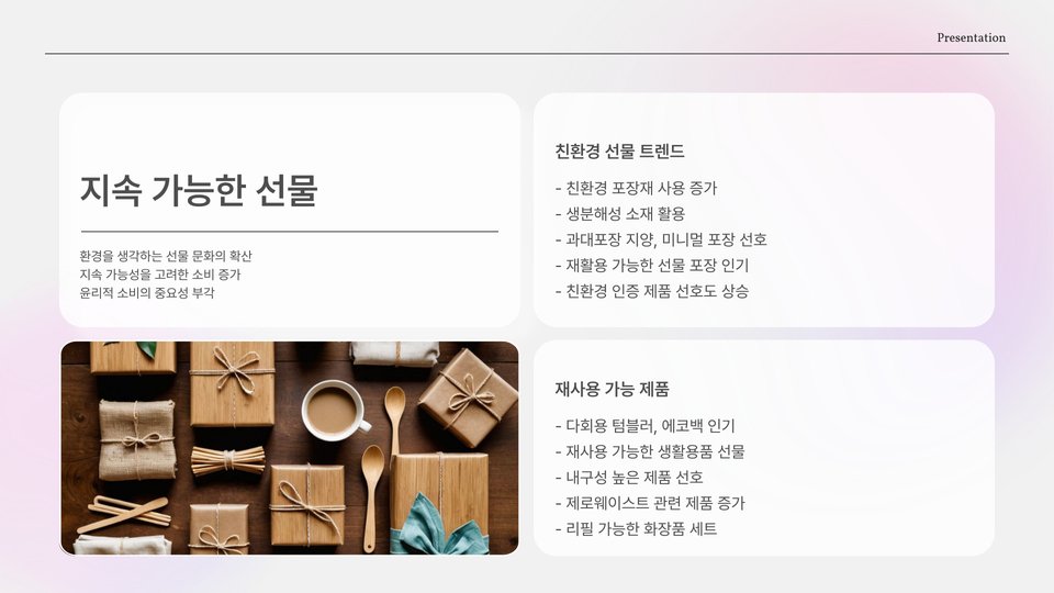 | 친환경 선물 세트 | 지속 가능한 제품 사용 욕구 | “환경을 생각하는 마음이 느껴진다” |
