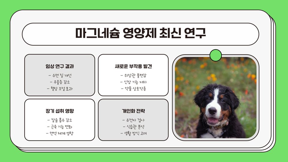 마그네슘 영양제는 인체 건강에 중요한 역할을 하지만, 부작용이 발생할 수 있습니다. 따라서, 각 개인의 건강 상태와 필요에 맞춘 복용법과 건강한 생리학적 반응을 유도하기 위한 방법이 필수적입니다. 위의 팁과 주의사항을 참고하여 자신에게 맞는 방법으로 마그네슘 영양제를 활용하세요.