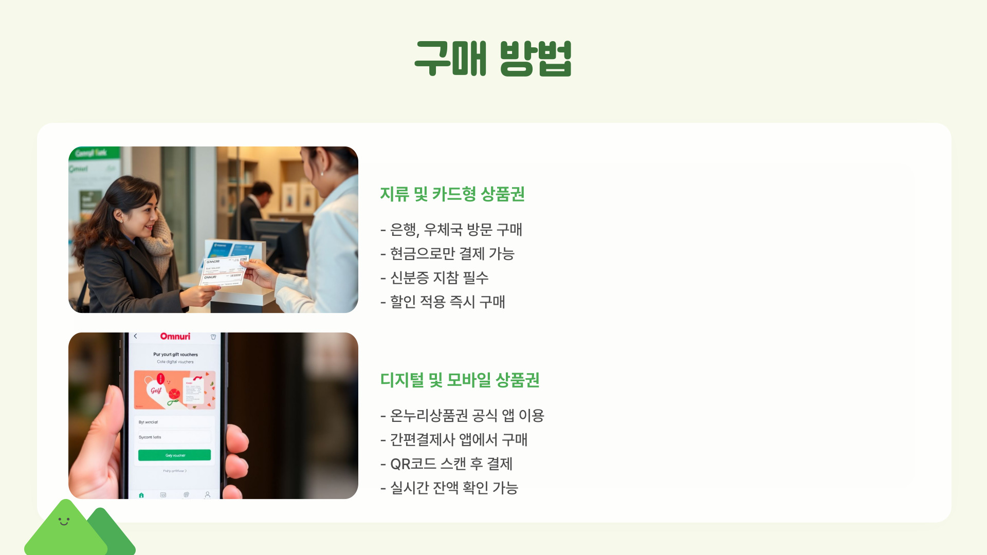 - 지류 상품권: 신한은행, 우리은행 등 16곳에서 구매 가능, 할인 5%