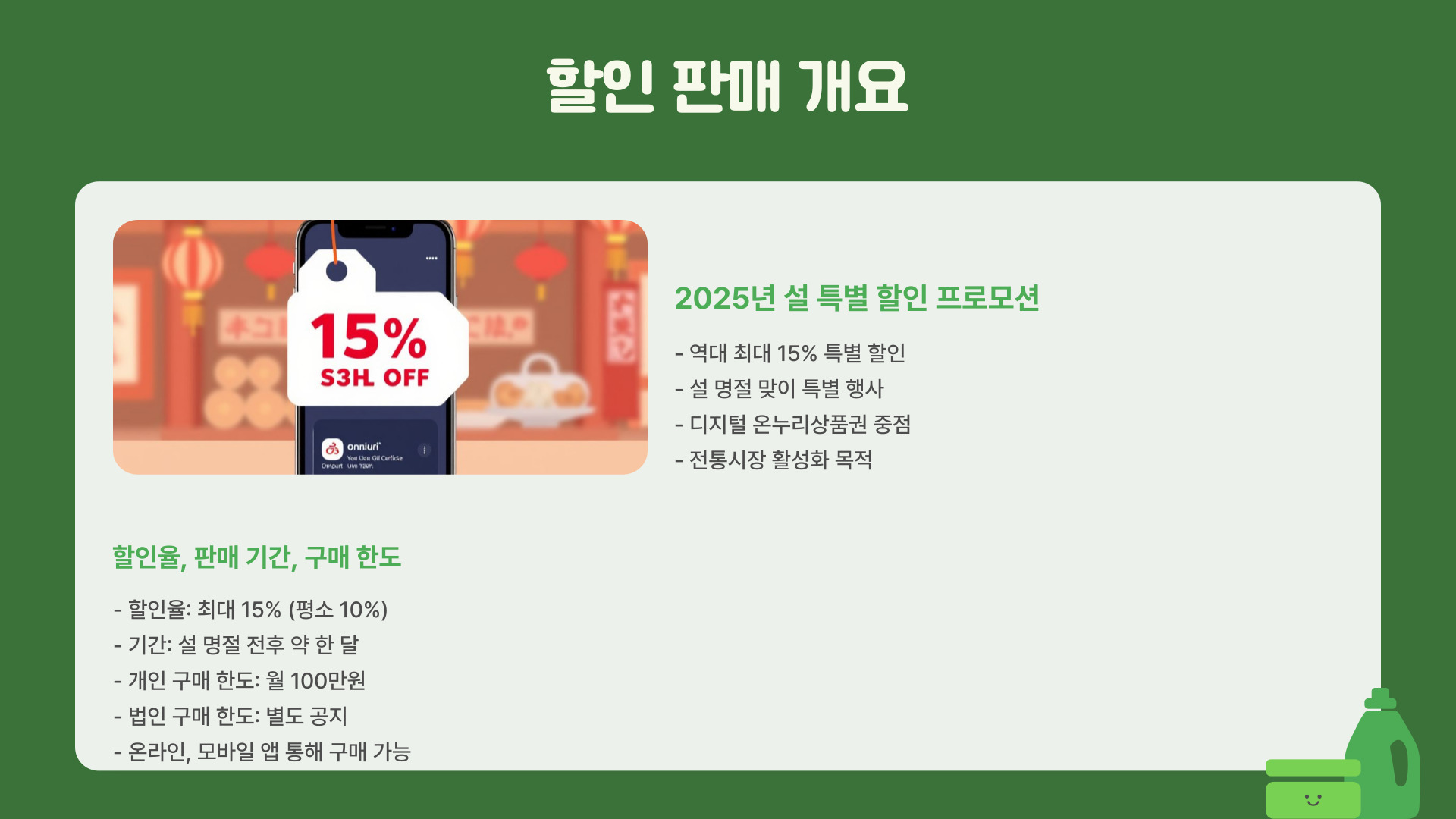 - 전자 상품권: 우리은행, IBK기업은행 등 7곳에서 구매 가능, 할인 5%